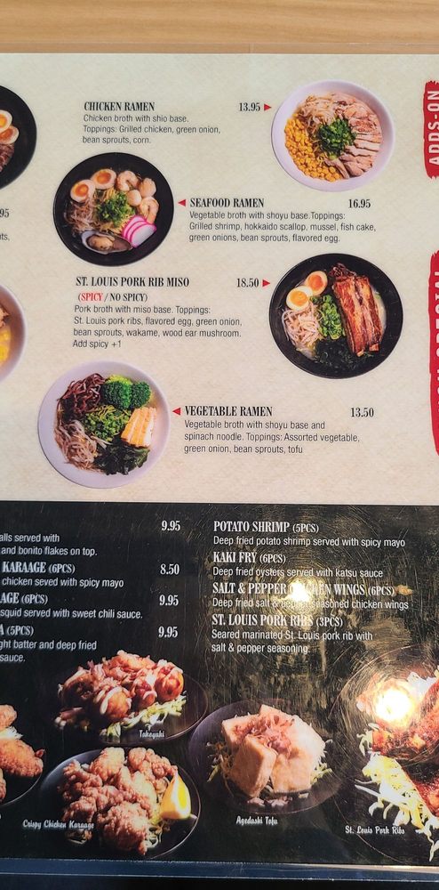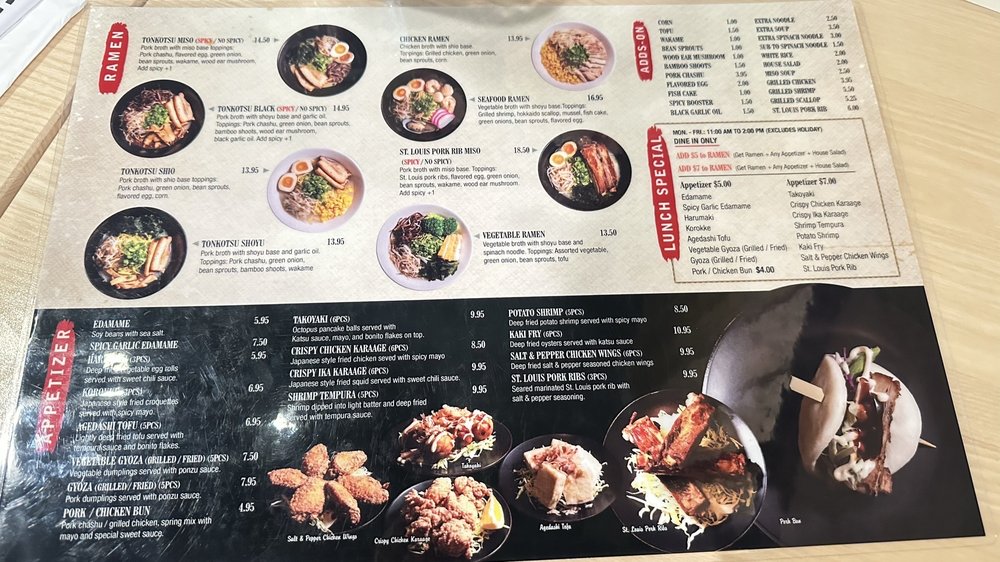 Pork broth with miso base, toppings: ST. Louis pork ribs, flavored egg, green onions, bean sprouts, wakame, wood ear mushroom and spicy booster.