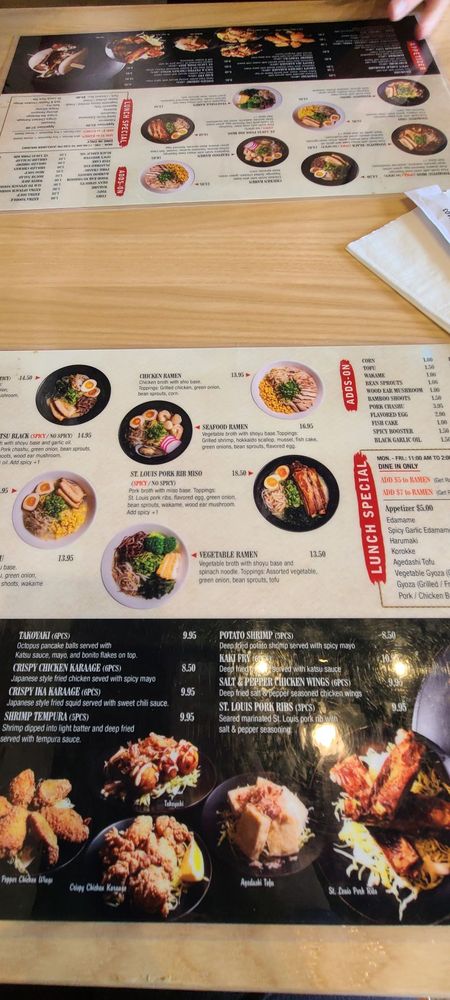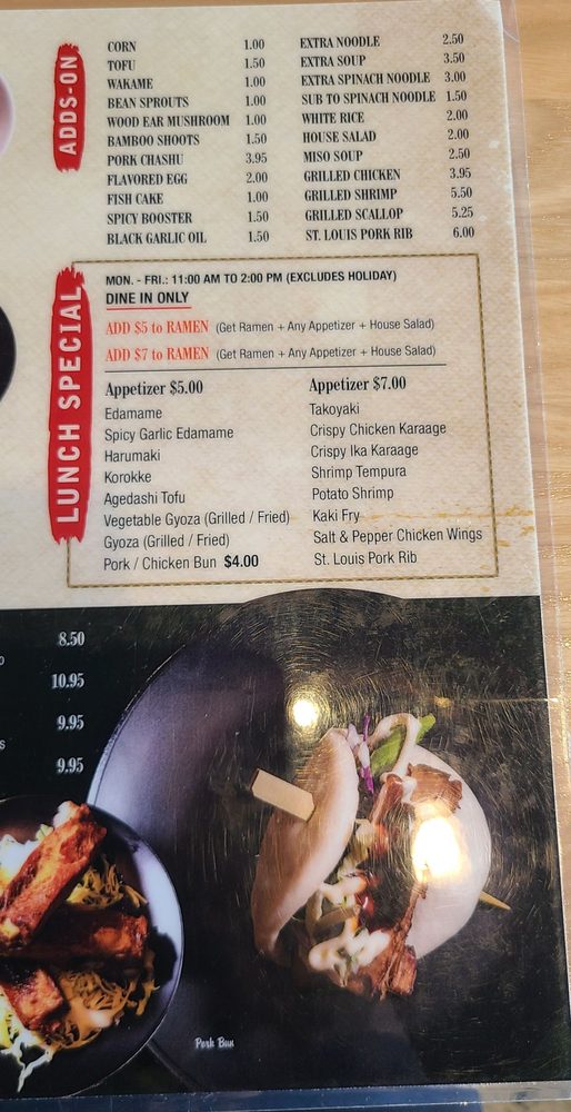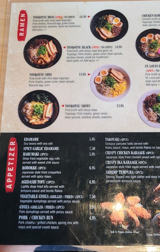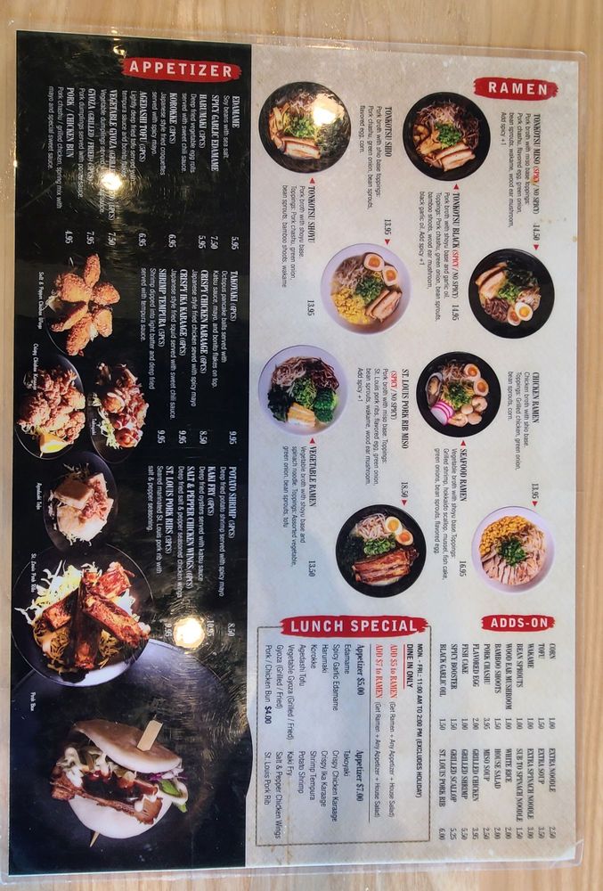 Pork broth with miso base, toppings: ST. Louis pork ribs, flavored egg, green onions, wood ear mushroom.